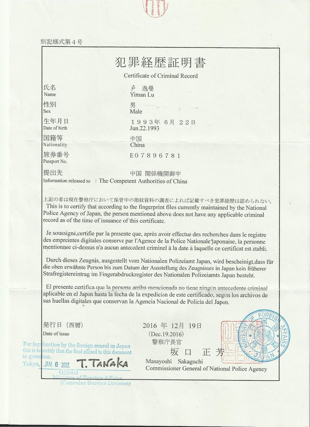 日本無犯罪記錄翻譯模版-各類證明翻譯-隨到隨譯-方便快捷